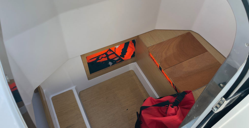 Cet open de moins de 7 mètre propose un carré avant convertible en bain de soleil et coin repas, une console centrale abritant une cabine de rangement, un leaning post doté d'un évier et une banquette arrière, le tout abritant de grands coffres de rangements.